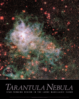This poster is 24 " by 30" in size, printed on quality poster paper. Retail Price=$ 10.00 Click "Add to Cart" button to purchase online now. ***This object is the only extra-galactic nebula which can be seen with the unaided eye. It is a faint patch of light at the eastern end of the Large Magellanic Cloud, 160,000 light years distant. A small telescope reveals narrow spindly tendrils of glowing gas which have been likened to the legs of a spider. The 'body' of the spider is the bright nebula seen near the centre of the photograph, while at its core is an extremely dense clump of very hot stars, until recently thought to a single, unusually massive star known as 30 Doradus. The very hot stars of 30 Dor are responsible for making the nebula visible. |
