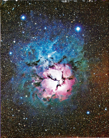 Stars, the Sun included, were born within clouds of dusty gas such as the Trifid Nebula. Measuring some forty light years across, this nebula contains enough gas to make many thousands of suns. Within it a number of young hot stars have already formed. The hottest cause the gas, mostly hydrogen, to emit its characteristic red light. Around the red emission nebula the gas contains many dust grains which preferentially reflect the blue component of starlight, and to the north (top) of the nebula can be seen a bright star which illuminates part of the dust to create a region of blue reflection. it In some parts of the nebula there are so many dust grains that they hide the glowing gas, producing the three dark lanes which give the object its name.